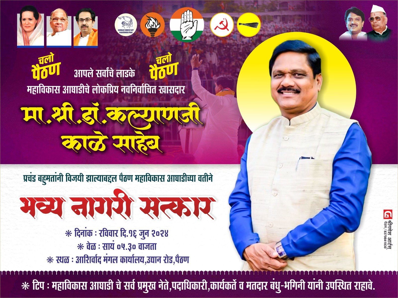 पैठण : जालना लोकसभेतील काँग्रेस आणि महाविकास आघाडीचे नवनिर्वाचित खासदार डॉ.कल्याण काळे साहेब यांचा जाहीर सत्कार समारंभ आयोजित करण्यात आला आहे. पैठण तालुक्यातील मतदारांनी डॉ.काळे यांना प्रचंड मताधिक्य दिले असल्याने पैठणकर उत्साही असल्याचे दिस...